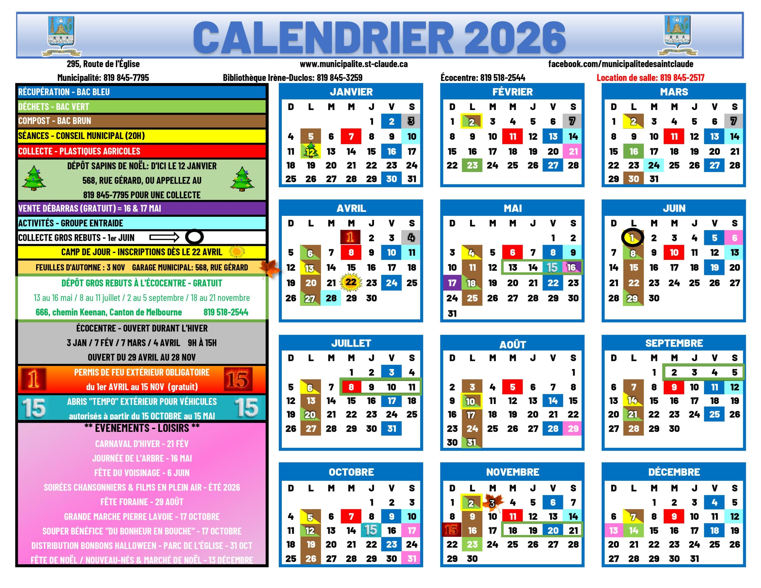Municipalité de Saint-Claude > Nouvelles > Non classé > Calendrier des collectes 2026