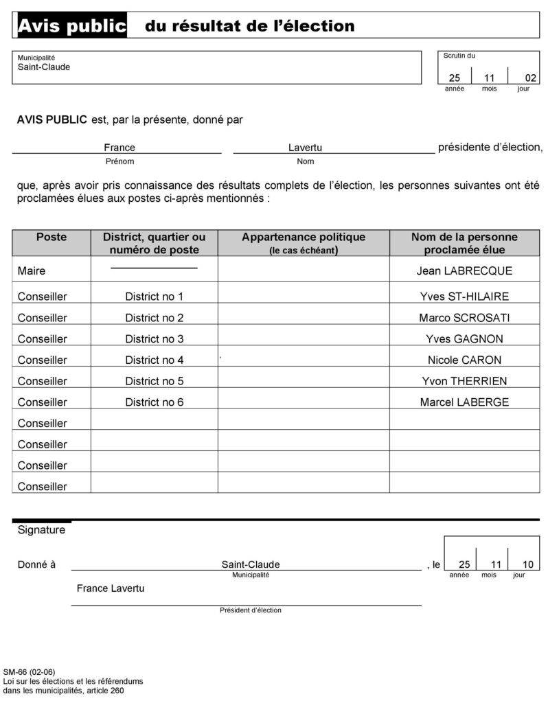 Voici le résultat officiel des élections municipales 2025 pour la Municipalité de Saint-Claude.